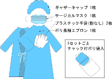 ギャザーキャプ×1枚、サージカルマスク×1枚、プラスチック手袋×2枚 長袖エプロン×1枚が、1組ずつ個包装でセットされています。